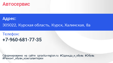 Автосервис по адресу 305022, Курская область, Курск, Халинская, 8а в дальнейшем Организация, размещена в следующих категориях: