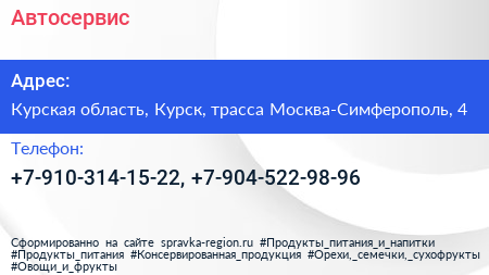 Автосервис по адресу Курская область, Курск, трасса Москва-Симферополь, 4 в дальнейшем Организация, размещена в следующих категориях: