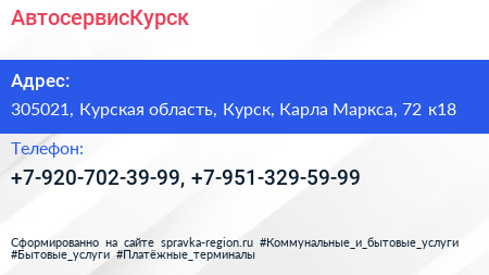 АвтосервисКурск по адресу 305021, Курская область, Курск, Карла Маркса, 72 к18 в дальнейшем Организация, размещена в следующих категориях: