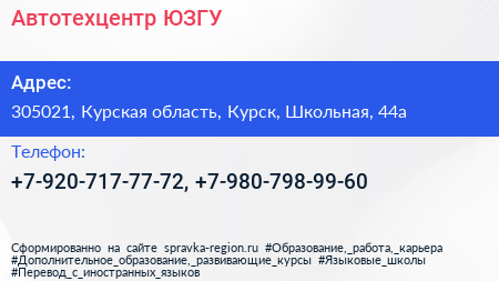 Автотехцентр ЮЗГУ по адресу 305021, Курская область, Курск, Школьная, 44а в дальнейшем Организация, размещена в следующих категориях: