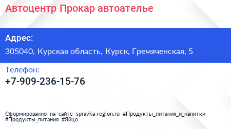 Автоцентр Прокар, автоателье по адресу 305040, Курская область, Курск, Гремяченская, 5 в дальнейшем Организация, размещена в следующих категориях: