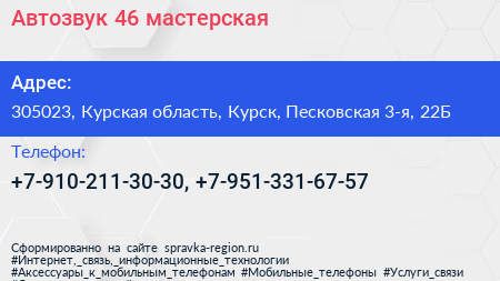 Автозвук 46, мастерская по адресу 305023, Курская область, Курск, Песковская 3-я, 22Б в дальнейшем Организация, размещена в следующих категориях: