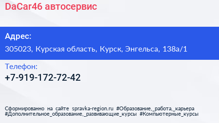 DaCar46, автосервис по адресу 305023, Курская область, Курск, Энгельса, 138а/1 в дальнейшем Организация, размещена в следующих категориях: