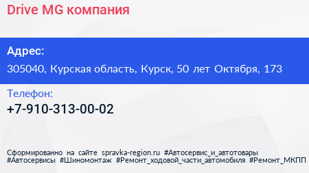 Drive-MG, компания по адресу 305040, Курская область, Курск, 50 лет Октября, 173 в дальнейшем Организация, размещена в следующих категориях: