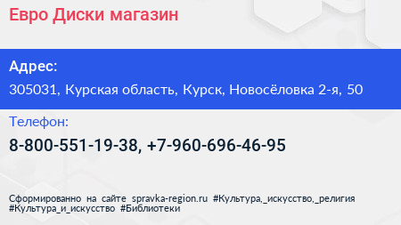 Евро-Диски, магазин по адресу 305031, Курская область, Курск, Новосёловка 2-я, 50 в дальнейшем Организация, размещена в следующих категориях: