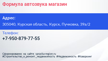 Формула автозвука, магазин по адресу 305040, Курская область, Курск, Пучковка, 39а/2 в дальнейшем Организация, размещена в следующих категориях: