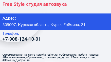 Free Style, студия автозвука по адресу 305007, Курская область, Курск, Ерёмина, 21 в дальнейшем Организация, размещена в следующих категориях: