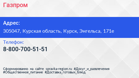 Газпром по адресу 305047, Курская область, Курск, Энгельса, 171е в дальнейшем Организация, размещена в следующих категориях: