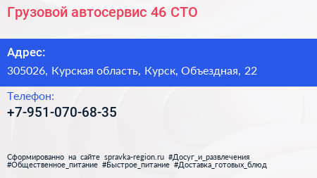 Грузовой автосервис 46, СТО по адресу 305026, Курская область, Курск, Объездная, 22 в дальнейшем Организация, размещена в следующих категориях: