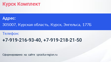 Курск Комплект по адресу 305007, Курская область, Курск, Энгельса, 177Б в дальнейшем Организация, размещена в следующих категориях:
