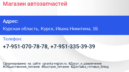 Магазин автозапчастей по адресу Курская область, Курск, Ивана Никитина, 1Б в дальнейшем Организация, размещена в следующих категориях: