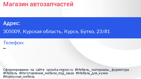 Магазин автозапчастей по адресу 305009, Курская область, Курск, Бутко, 23/81 в дальнейшем Организация, размещена в следующих категориях: