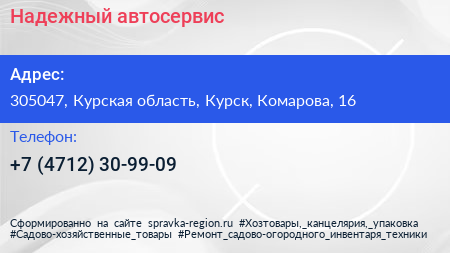 Надежный автосервис по адресу 305047, Курская область, Курск, Комарова, 16 в дальнейшем Организация, размещена в следующих категориях: