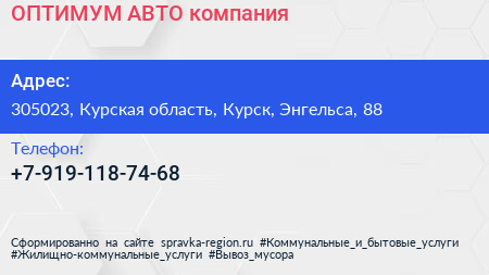 ОПТИМУМ АВТО, компания по адресу 305023, Курская область, Курск, Энгельса, 88 в дальнейшем Организация, размещена в следующих категориях: