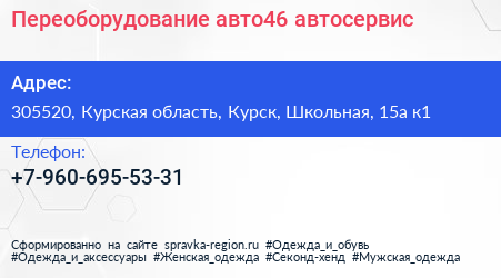 Переоборудование авто46, автосервис по адресу 305520, Курская область, Курск, Школьная, 15а к1 в дальнейшем Организация, размещена в следующих категориях: