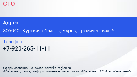 СТО по адресу 305040, Курская область, Курск, Гремяченская, 5 в дальнейшем Организация, размещена в следующих категориях: