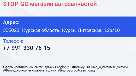 STOP&GO, магазин автозапчастей по адресу 305023, Курская область, Курск, Литовская, 12а/10 в дальнейшем Организация, размещена в следующих категориях: