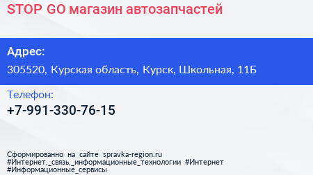 STOP&GO, магазин автозапчастей по адресу 305520, Курская область, Курск, Школьная, 11Б в дальнейшем Организация, размещена в следующих категориях: