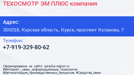ТЕХОСМОТР ЭМ-ПЛЮС, компания по адресу 305018, Курская область, Курск, проспект Кулакова, 7 в дальнейшем Организация, размещена в следующих категориях: