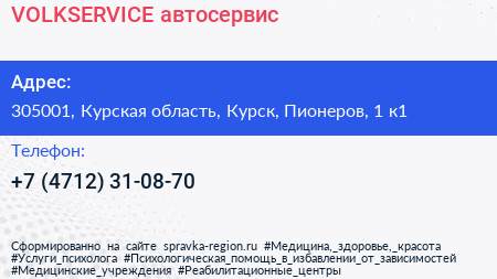 VOLKSERVICE, автосервис по адресу 305001, Курская область, Курск, Пионеров, 1 к1 в дальнейшем Организация, размещена в следующих категориях: