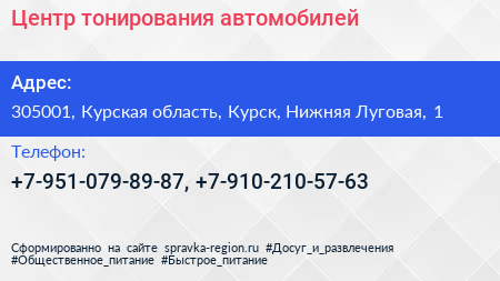 Центр тонирования автомобилей по адресу 305001, Курская область, Курск, Нижняя Луговая, 1 в дальнейшем Организация, размещена в следующих категориях: