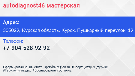 autodiagnost46, мастерская по адресу 305029, Курская область, Курск, Пушкарный переулок, 19 в дальнейшем Организация, размещена в следующих категориях: