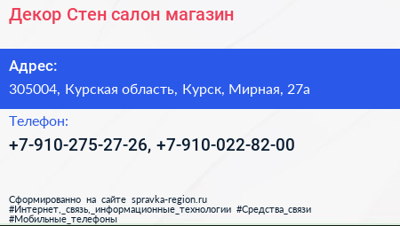 Декор Стен, салон-магазин по адресу 305004, Курская область, Курск, Мирная, 27а в дальнейшем Организация, размещена в следующих категориях: