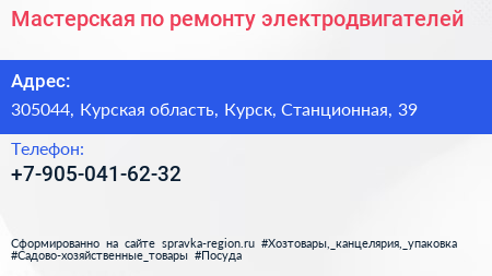 Мастерская по ремонту электродвигателей по адресу 305044, Курская область, Курск, Станционная, 39 в дальнейшем Организация, размещена в следующих категориях: