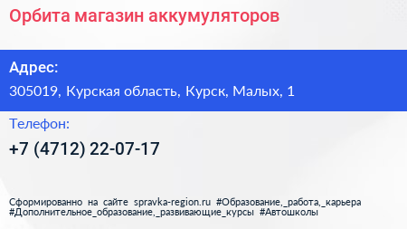 Орбита, магазин аккумуляторов по адресу 305019, Курская область, Курск, Малых, 1 в дальнейшем Организация, размещена в следующих категориях: