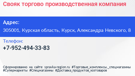 Свояк, торгово-производственная компания по адресу 305001, Курская область, Курск, Александра Невского, 8 в дальнейшем Организация, размещена в следующих категориях: