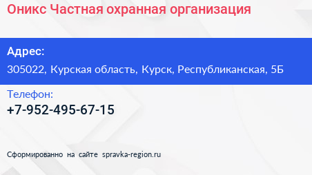 Оникс, Частная охранная организация по адресу 305022, Курская область, Курск, Республиканская, 5Б в дальнейшем Организация, размещена в следующих категориях:
