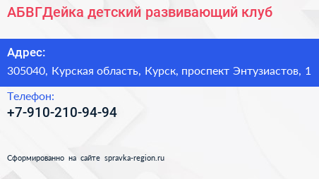 АБВГДейка, детский развивающий клуб по адресу 305040, Курская область, Курск, проспект Энтузиастов, 1 в дальнейшем Организация, размещена в следующих категориях: