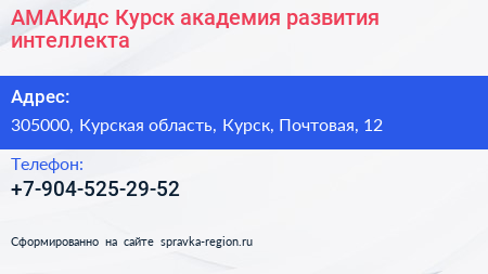 АМАКидс Курск, академия развития интеллекта по адресу 305000, Курская область, Курск, Почтовая, 12 в дальнейшем Организация, размещена в следующих категориях: