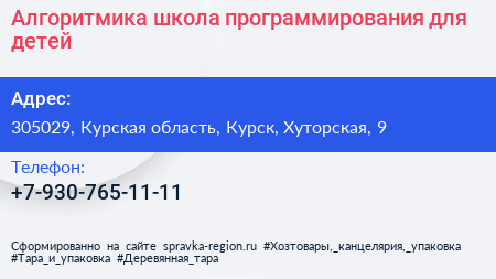 Алгоритмика, школа программирования для детей по адресу 305029, Курская область, Курск, Хуторская, 9 в дальнейшем Организация, размещена в следующих категориях: