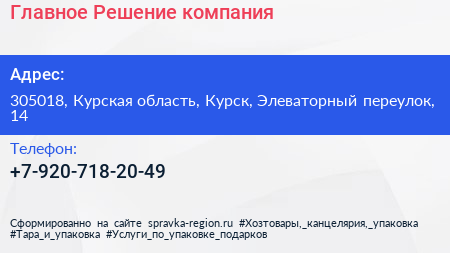 Главное Решение, компания по адресу 305018, Курская область, Курск, Элеваторный переулок, 14 в дальнейшем Организация, размещена в следующих категориях:
