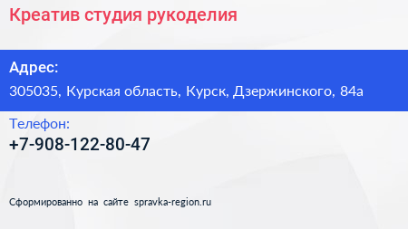 Креатив, студия рукоделия по адресу 305035, Курская область, Курск, Дзержинского, 84а в дальнейшем Организация, размещена в следующих категориях:
