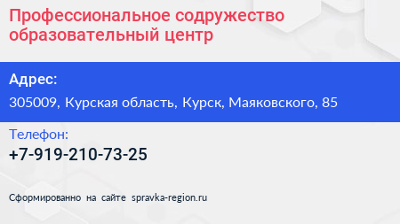 Профессиональное содружество, образовательный центр по адресу 305009, Курская область, Курск, Маяковского, 85 в дальнейшем Организация, размещена в следующих категориях: