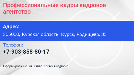 Профессиональные кадры, кадровое агентство по адресу 305000, Курская область, Курск, Радищева, 35 в дальнейшем Организация, размещена в следующих категориях:
