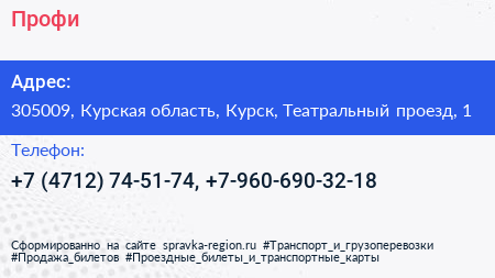 Профи+ по адресу 305009, Курская область, Курск, Театральный проезд, 1 в дальнейшем Организация, размещена в следующих категориях: