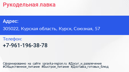 Рукодельная лавка по адресу 305022, Курская область, Курск, Союзная, 57 в дальнейшем Организация, размещена в следующих категориях: