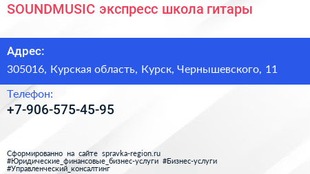 SOUNDMUSIC, экспресс-школа гитары по адресу 305016, Курская область, Курск, Чернышевского, 11 в дальнейшем Организация, размещена в следующих категориях: