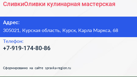 СливкиОливки, кулинарная мастерская по адресу 305021, Курская область, Курск, Карла Маркса, 68 в дальнейшем Организация, размещена в следующих категориях: