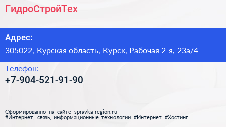ГидроСтройТех по адресу 305022, Курская область, Курск, Рабочая 2-я, 23а/4 в дальнейшем Организация, размещена в следующих категориях: