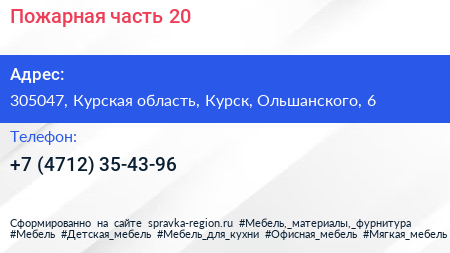 Пожарная часть №20 по адресу 305047, Курская область, Курск, Ольшанского, 6 в дальнейшем Организация, размещена в следующих категориях:
