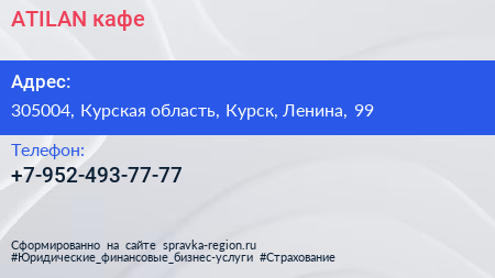 ATILAN, кафе по адресу 305004, Курская область, Курск, Ленина, 99 в дальнейшем Организация, размещена в следующих категориях:
