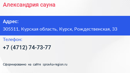 Александрия, сауна по адресу 305511, Курская область, Курск, Рождественская, 33 в дальнейшем Организация, размещена в следующих категориях: