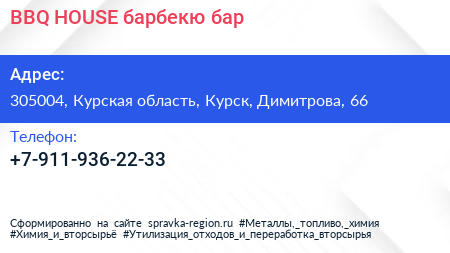 BBQ HOUSE, барбекю-бар по адресу 305004, Курская область, Курск, Димитрова, 66 в дальнейшем Организация, размещена в следующих категориях: