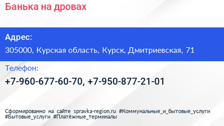 Банька на дровах по адресу 305000, Курская область, Курск, Дмитриевская, 71 в дальнейшем Организация, размещена в следующих категориях: