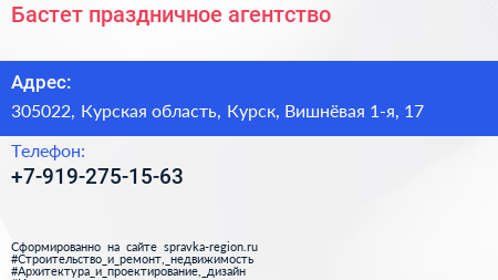 Бастет, праздничное агентство по адресу 305022, Курская область, Курск, Вишнёвая 1-я, 17 в дальнейшем Организация, размещена в следующих категориях: