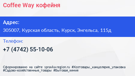 Coffee Way, кофейня по адресу 305007, Курская область, Курск, Энгельса, 115д в дальнейшем Организация, размещена в следующих категориях:
